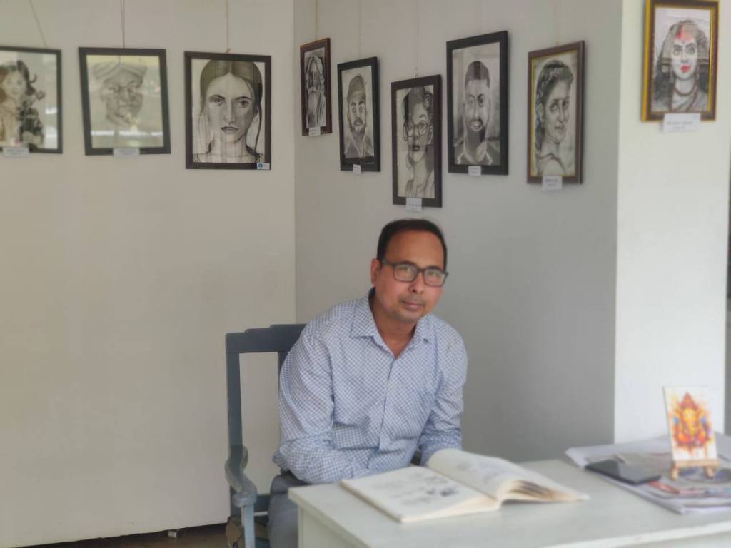 Vivekananda Bagchi, an emerging artist and founder of the Prism Pencil Portrait and Art Training Institute, showcases student works at Slate Nest Art Gallery while…